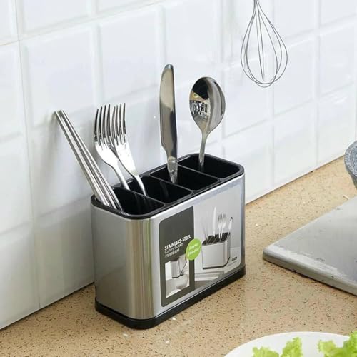 Generic - حامل ادوات المطبخ مع 4 مساحات تخزين - منظم ادوات مائدة مقاوم للصدا من الستانلس ستيل مع صينية لتقطير المياه (فضي (قطعة واحدة)