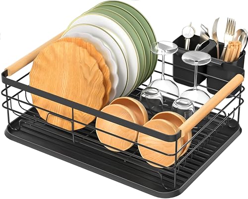 Generic - رف تجفيف الاطباق والاواني المطبخ، اطار معدني قوي مع مقبض خشبي مريح وصينية ادوات قابلة للازالة لسهولة الاستخدام والتنظيف