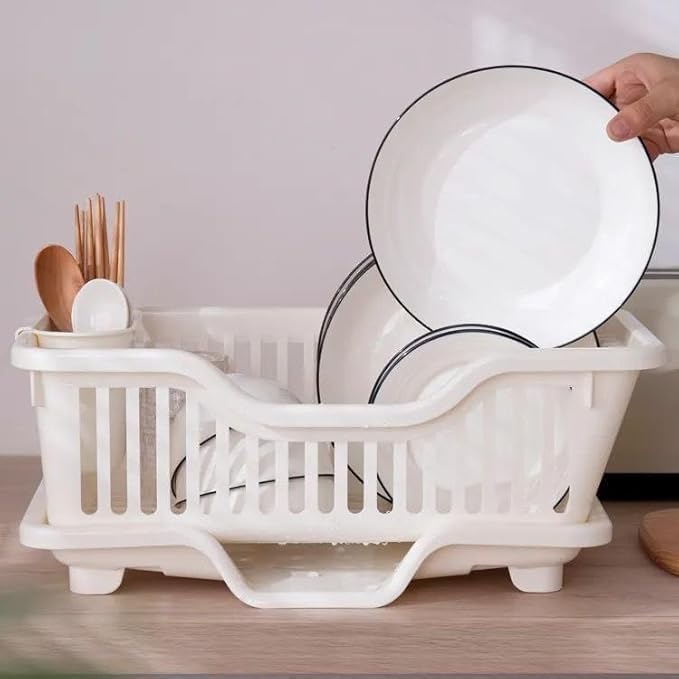 Generic - رف تجفيف أطباق المطبخ مع حامل أدوات المطبخ، لوح تصريف ومنظم للأطباق، أبيض