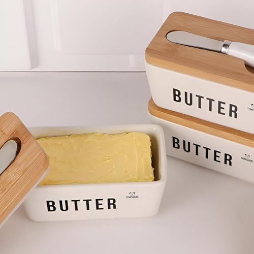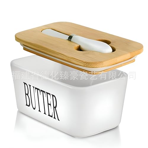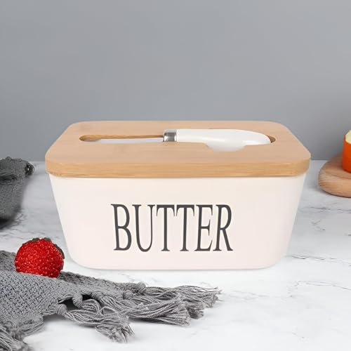 Generic - علبة زبدة أنيقة من البورسلين مع غطاء علوي من الخيزران وسكينة من الفولاذ المقاوم للصدأ لأساسيات المطبخ