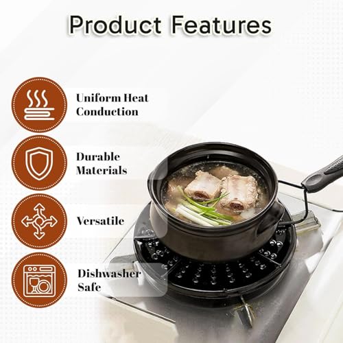- رائع لأواني الطهي الفخارية والطواجن. يبطئ التسخين ويوزعه بالتساوي — مما يمنع التشققات والاحتراق والتلف الناتج من الحرارة. يعمل أيضًا بشكل ممتاز مع إبريق القهوة الإيطالي، وأباريق الموكا، والأواني المطلية بالمينا، والأواني النحاس، وحلل الفولاذ المقاوم للصدأ، وغلايات الشاي، ووعاء الصوص، وغيرها.