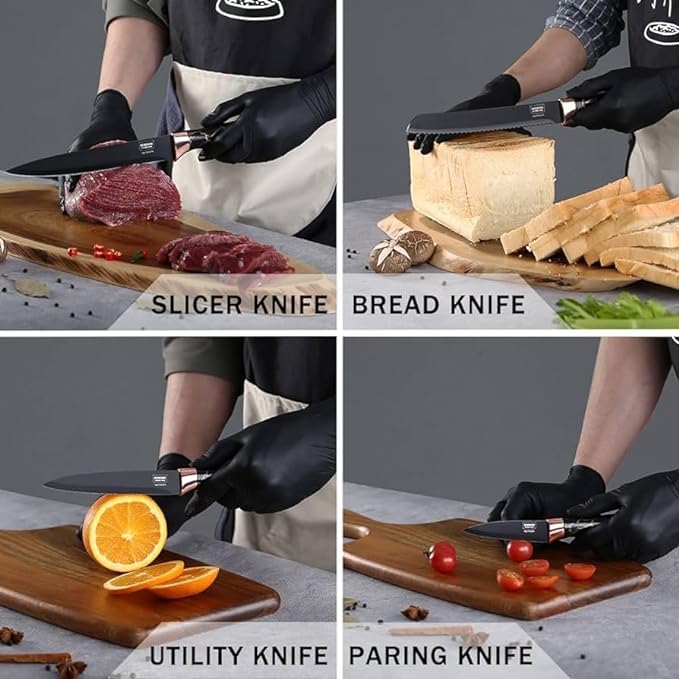 - مجموعة السكاكين عالية الجودة، تأتي المجموعة مع حامل أنيق للتخزين، مما يحافظ على تخزين سكاكينك بأمان وسهولة الوصول إليها. تتميز السكاكين بشفرة مطلية بطبقة غير لاصقة، سكين الشيف (18.8 سم)، وسكين النحت (18 سم)، وسكين متعددة الأغراض (17.5 سم)، وسكين تقشير (8.5 سم)، ومقص مطبخ متعدد الأغراض (20 سم)، بالإضافة إلى سكين مقاس 12.5 سم، سكاكين المطبخ المكونة من 7 قطع مصنوعة من الستانلس ستيل عالي الجودة، مما يضمن المتانة ومقاومة الصدأ والتآكل، مما يجعلها إضافة تدوم طويلاً لمطبخك