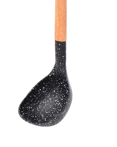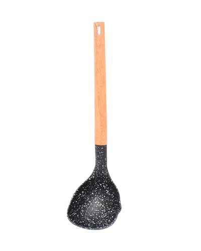- مزايا التصميم: مغرفة طهي أنيقة بنمط أسود منقط مع مقبض خشبي متين وفتحة تعليق مريحة للتخزين