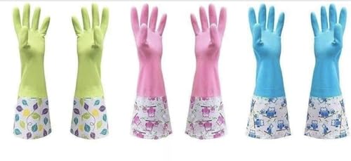 Generic - قفازات مطاطية طويلة للمطبخ، مقاومة للماء، مع نقش زخرفي، ٣ ألوان، طول ٤٥ سم