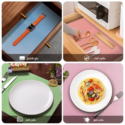 - يبلغ مقاس كل سجادة 30 × 45 سم، مما يوفر تغطية واسعة للأرفف والأسطح القياسية، مما يضمن ملاءمة محكمة دون تداخل أو انزلاق أثناء الاستخدام اليومي.