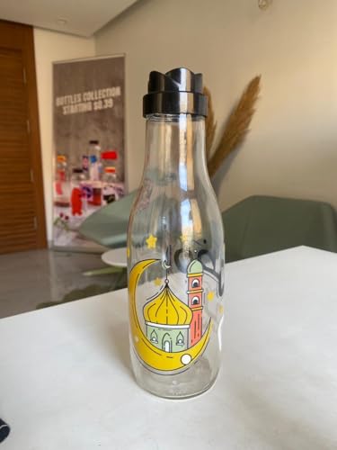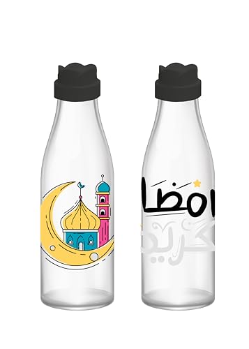 Kitchen's - زجاجة مياه بتصميم اسلامي، زجاجة شفافة بغطاء اسود، موضوع رمضان مع مسجد وهلال