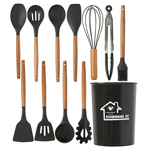 ChiefAssist - طقم توزيع من السيليكون للمطبخ بمقبض خشبي. طقم توزيع من السيليكون مقاومة للحرارة حتى 446 درجة فهرنهايت، خالية من مادة BPA، ادوات مطبخ امنة للاستخدام في غسالة الصحون غير لاصقة (12 قطعة في العبوة)، رمادي
