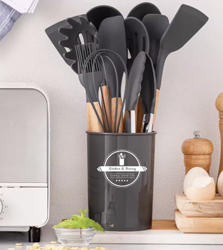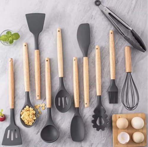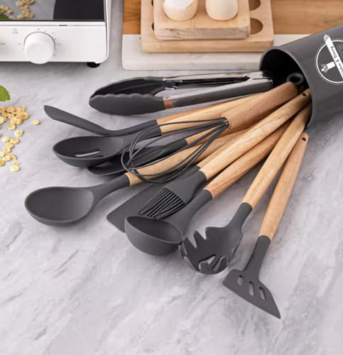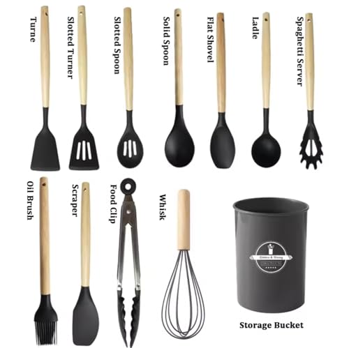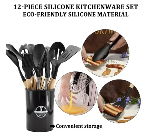 Mulk - مجموعة ادوات مطبخ من السيليكون، 12 قطعة، ادوات غير لاصقة للطبخ والخبز والشواء، مقبض خشبي (خيزران، اسود)