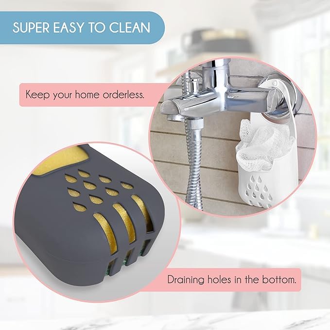 - تصميم موفر للمساحة: يتمتع حامل ليفة الجلي الخاص بنا بتصميم صغير الحجم وموفر للمساحة مما يجعله ملائمًا تمامًا لأي حوض مطبخ. بفضل علاقته القوية يمكنك تعليقه بسهولة على صنبور المغسلة أو باب الدولاب مما يحرر مساحة سطح العمل الثمينة.