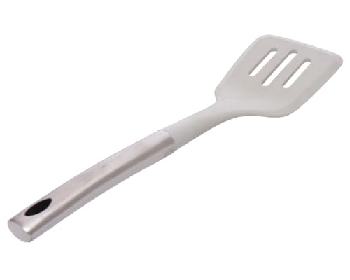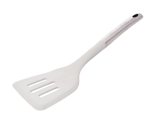 Generic - معلقة سباتولا للمطبخ بمقبض من الفولاذ المقاوم للصدأ، رأس نايلون أبيض بتصميم مشقوق.