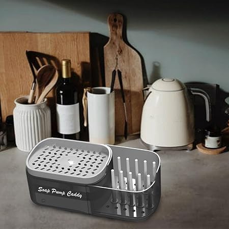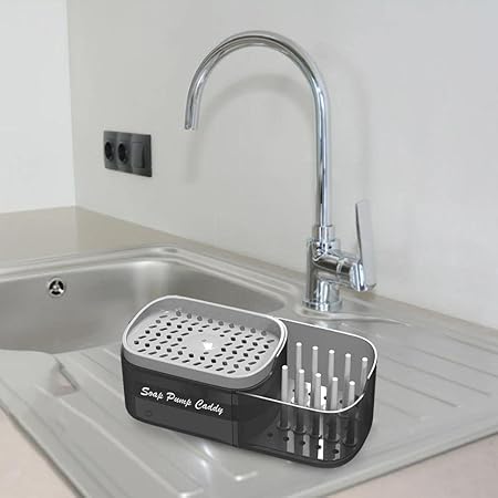 - تصميم متكامل: موزع صابون 2 في 1 مع حامل إسفنج ومساحة تخزين، يوفر حل عملي لتنظيم حوض المطبخ