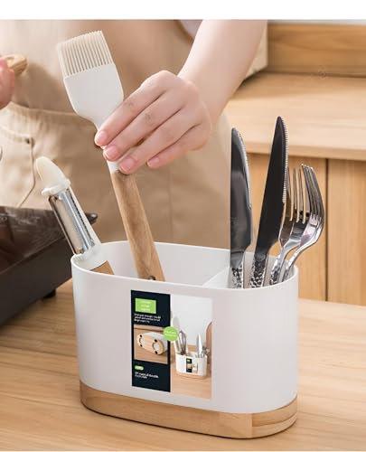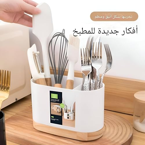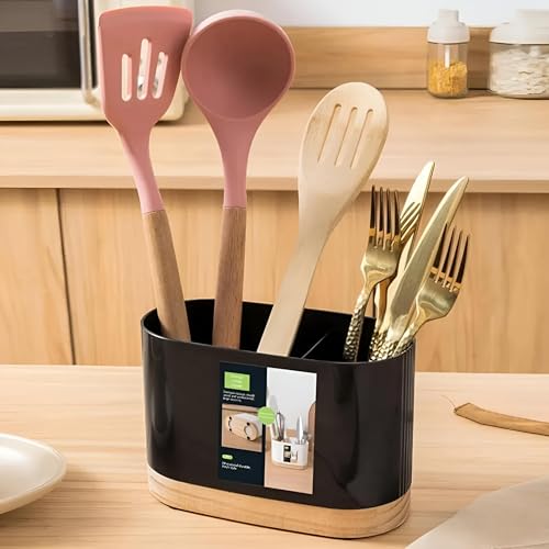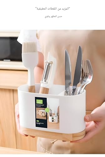 Generic - مصفاة معالق للمطبخ - مصفاة بلاستيكية متعددة الأقسام مع قاعدة خشبية متينة مصممة لتبسيط تحضير الطعام وتنظيم أدوات تناول الطعام في المطابخ المزدحمة