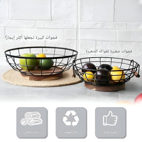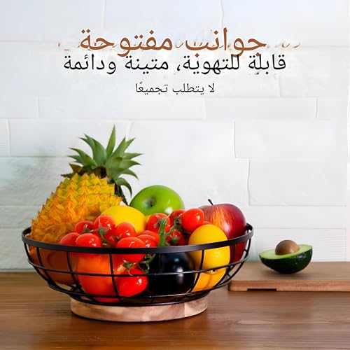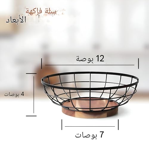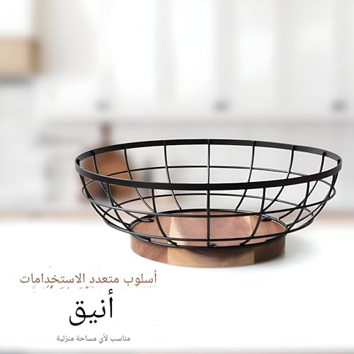Generic - سلة فاكهة سلكية سوداء انيقة مع قاعدة من خشب الاكاسيا الصلب للمنتجات الطازجة، مصممة للاستخدام على سطح الطاولة، قطر 12 انش، مثالية للفواكه والمخبوزات