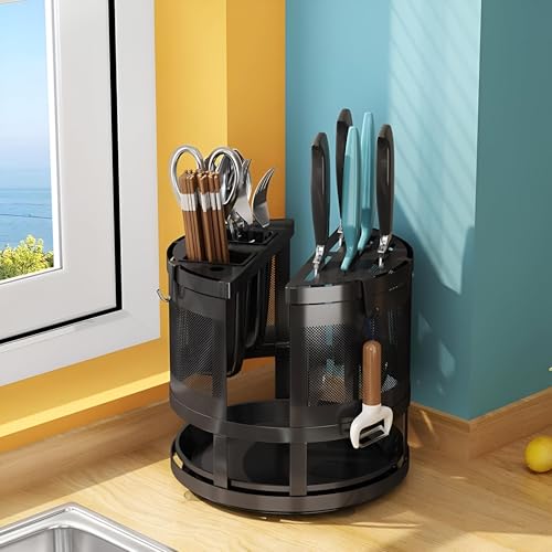 Generic - رف دوار للمطبخ - الحل الأمثل لتخزين عيدان تناول الطعام وتنظيم سطح مطبخك كما يعمل كرف لتجفيف الملاعق والسكاكين لمستلزمات المطبخ والإكسسوارات 1 منظم معدن اسود