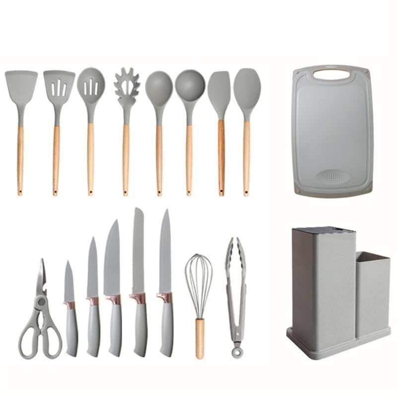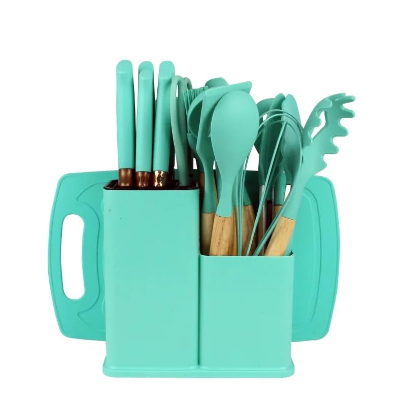 Generic - أدوات مطبخ وسكاكين بمقابض خشب، أدوات للطبخ مصنوعة من السيليكون مع حامل ولوح تقطيع، أواني طهي غير لاصقة ومقاومة للحرارة، تصميم عصري، 18 قطعة، (لون أخضر فاتح)