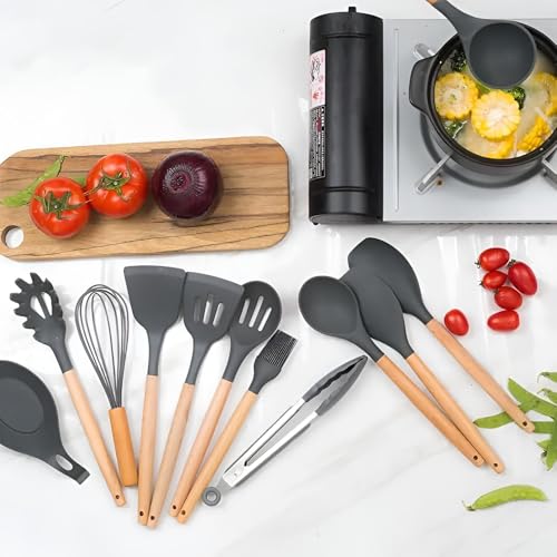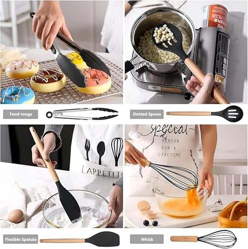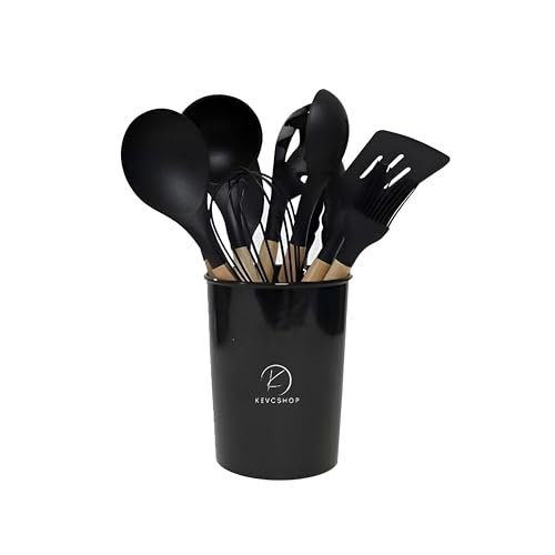 Generic - مجموعة أدوات المطبخ من 12 قطعة خالية من البيسفينول ايه بمقابض خشبية، أدوات لا تسبب الخدش وملاعق وخفاقة وفرشاة ومغرفة وحل تخزين ذكي (أسود)