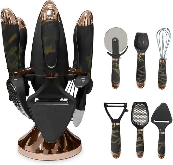 - طقم كامل من 7 قطع - يتضمن أدوات مطبخ أساسية من الفولاذ المقاوم للصدأ مع مضرب ومبشرة وحامل لجميع احتياجات الطبخ والخبز.