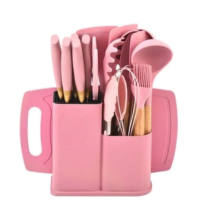 Generic - طقم أدوات مطبخ وسكاكين بمقابض خشب بتصميم حديث مكون من 19 قطعة من أدوات الطهي السيليكون مع حامل مقاومة للحرارة وآمنة للاستخدام مع أواني الطهي المقاومة للالتصاق، لون وردي