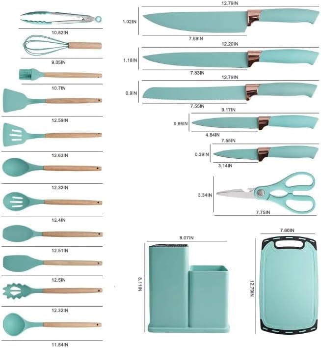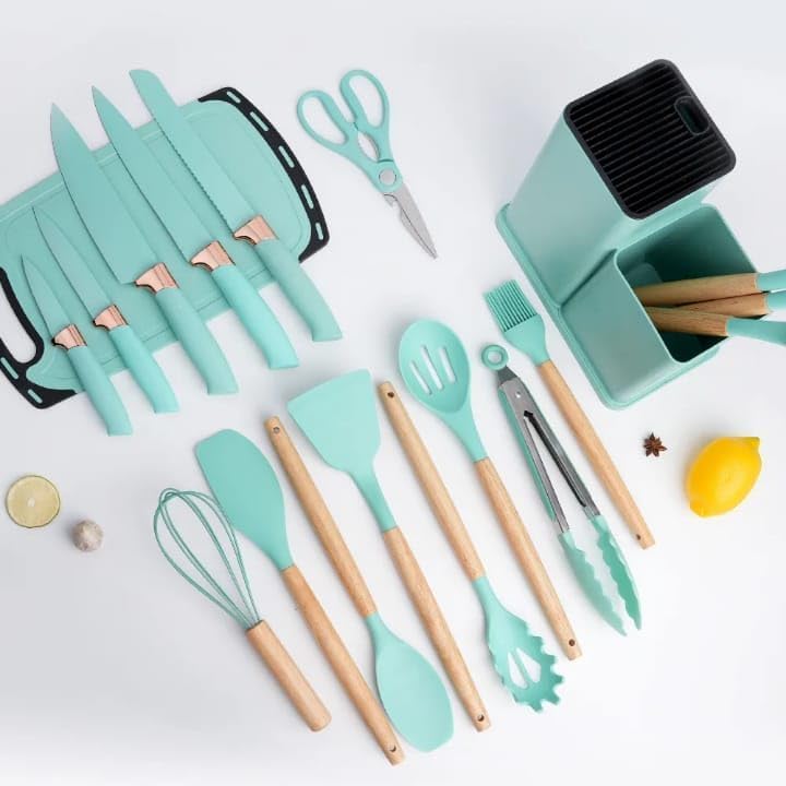 - طقم كامل من 19 قطعة: يتضمن جميع أدوات تناول الطعام الأساسية، مثل ملعقة سباتولا والمغارف والملاقط والسكاكين، المصممة لتلبية جميع احتياجات الطبخ.