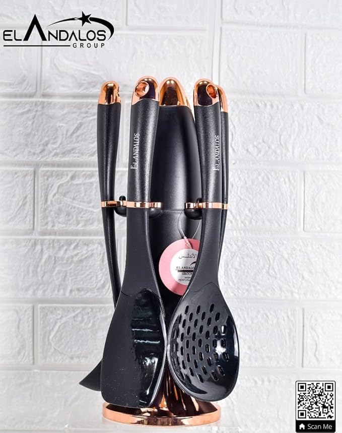 - مجموعة كاملة: مجموعة أدوات مطبخ شاملة تتميز بأدوات أساسية بلمسة نهائية أنيقة باللونين الأسود والذهبي الوردي، بما في ذلك حامل تخزين مطابق