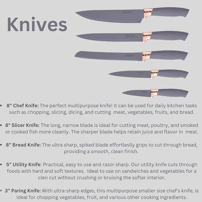 - مواد فاخرة: سكاكين من الستانلس ستيل عالي الجودة مع طلاء واقٍ وأدوات سيليكون متينة تضمن أداءً يدوم طويلاً