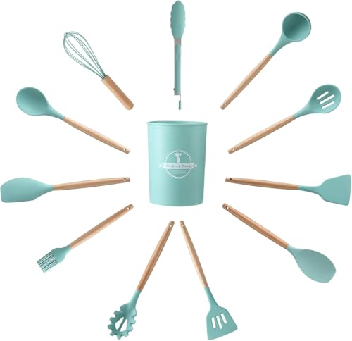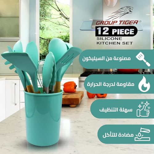 Generic - أدوات تناول الطعام سيليكون مع حامل للمطبخ، أدوات طهي مقاومة للالتصاق ومقاومة للحرارة، تتضمن معلقة سباتولا ومساكة طعام ومضرب ومغرفة وفرشاة ومعلقة مخرمة لتقليب الطعام ومعلقة، 12 قطعة (أخضر)