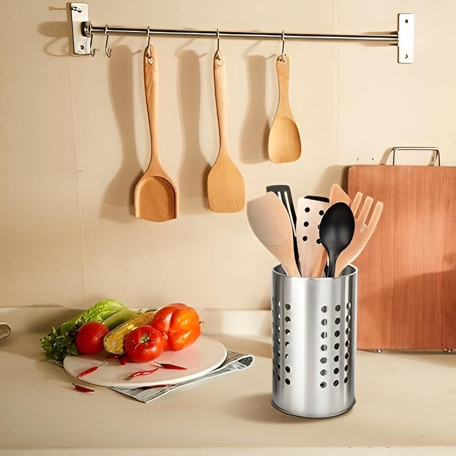- مصنوع من الفولاذ المقاوم للصدأ عالي الجودة، حامل أدوات المطبخ هذا مقاوم للصدأ، ما يضمن بقائه قويًا ومتينًا لسنوات قادمة. لا يوفر الهيكل طول العمر فحسب، بل يضمن أيضًا أن الحامل يمكنه تحمل التلف الناتج عن الاستعمال اليومي في المطبخ المزدحم. يدعم تصميمه القوي مجموعة متنوعة من الأدوات، ما يجعله خيارًا عمليًا لأي شخص يتطلع إلى تعزيز تنظيم مطبخه دون التنازل عن الجودة.