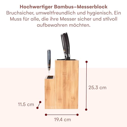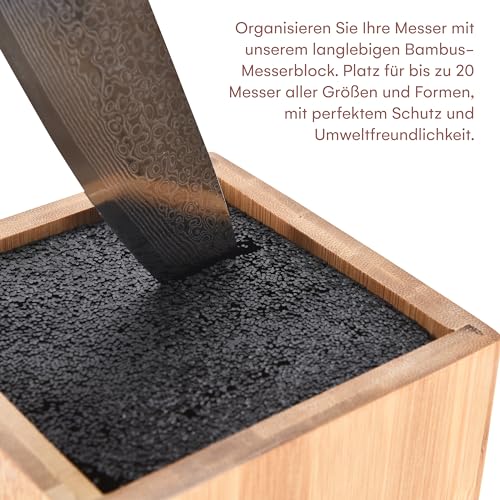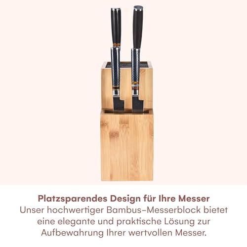 - حامل سكاكين متين - هذا المكعب الخشبي للسكاكين مصنوع من الخيزران عالي الجودة الذي يمكنه تحمل التلف الناتج عن الاستعمال اليومي. بالإضافة إلى ذلك، فإن كتلة السكاكين مع حشوة الشعيرات تحتوي على طبقة واقية تنزع عليها خرزات الماء.