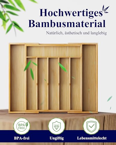- هيكل معزز: مصنوع من الخيزران السميك، مقسم الأدراج هذا مقاوم للخدش ومتين للغاية - مثالي كمنظم لأدوات المائدة لأدراج المطبخ. يسمح الطلاء الطارد للماء بتنظيف سريع وبدون مجهود: ببساطة امسحه بقطعة قماش مبللة وجففه بالهواء للحصول على مظهر نظيف دائمًا.