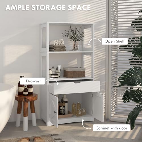 kleankin - دولاب للحمام من كلينكين، دولاب تخزين عصري للحمام، دولاب للفوط مع أبواب بتصميم ريفي ودرج ورفين مفتوحين، أبيض