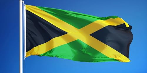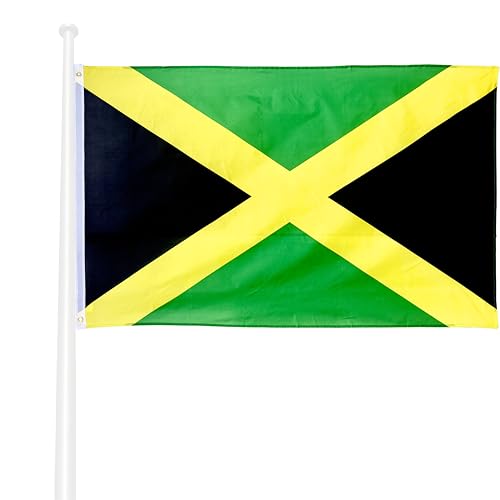 KliKil - علم جامايكا كبير من كليكيل مقاس 150 × 90 سم مع فتحتين معدنيتين لسهولة التركيب وطباعة متينة ومقاومة للاشعة فوق البنفسجية والرياح الخفيفة - علم جامايكا الرسمي للديكور