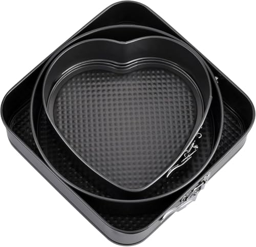 AREXOL - طقم صواني كيك كلبس 3 قطع بأشكال دائري ومربع وقلب مقاسات 24 و26 و28 سم خامة صاج متينة غير لاصقة سهلة الفك لصنع التشيز كيك والحلويات بأنواعها المنزلية