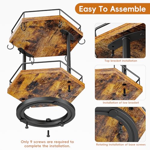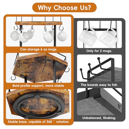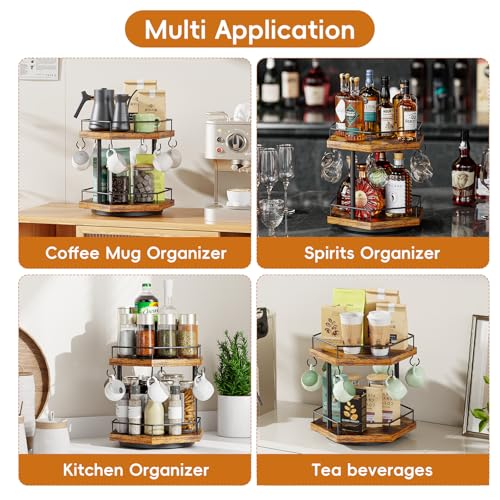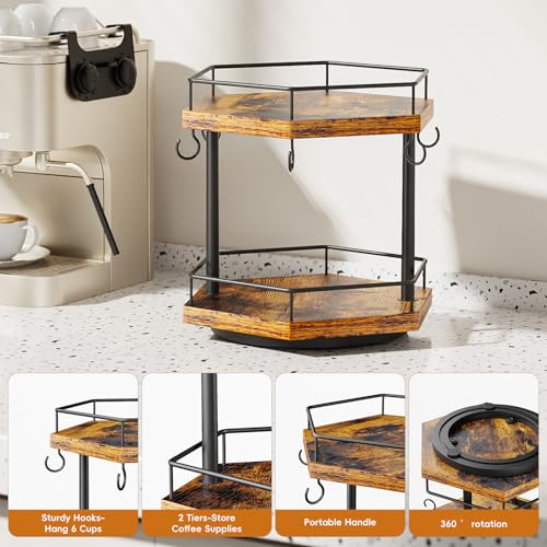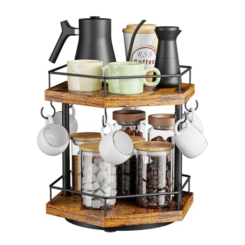 KLM - منظم ركن القهوة للمنضدة بطبقتين، رف محطة قهوة متعدد الوظائف مع حامل لأكواب القهوة ورف لتخزين الملحقات بـ 6 خطافات مع حامل أكواب دوار 360 درجة للمنزل والمكتب من KLM