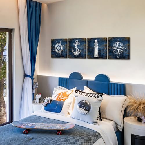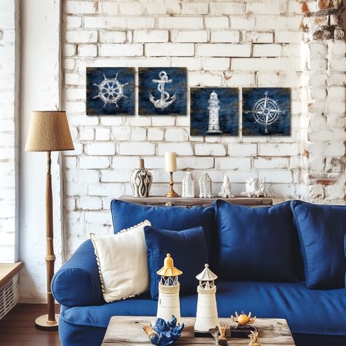 KLVOS - تابلوه فني للحائط من القماش بتصميم بحري بلون ازرق كحلي لمرساة قارب ورسومات دفة ومنارة بنمط ريفي على الشاطئ وديكور للمنزل جاهزة للتعليق للحمام وغرفة المعيشة 12× 12 بوصة 4 لوحات كلفوس