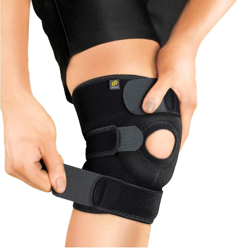 phyzioline - دعامة للركبة بفتحة للرضفة مع حزام قابل للتعديل ونيوبرين سميك للغاية ومزودة بمسامات للتهوية لتصحيح الوضعية، مقاس واحد يناسب الركبة اليمنى واليسرى، عبوة واحدة، لون أسود