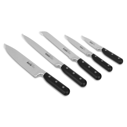 - مجموعة كاملة: تتضمن مجموعة السكاكين الاحترافية المكونة من 5 قطع سكاكين مطبخ أساسية مع حامل تخزين أسود متناسق ولوح تقطيع إضافي لإعداد الطعام الشامل.