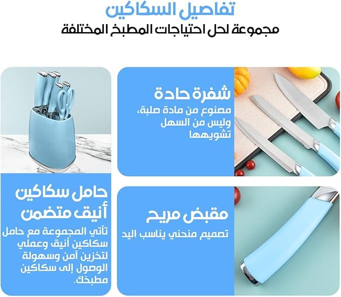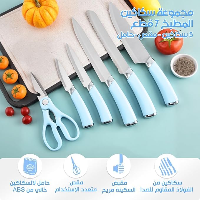 - طقم سكاكين مطبخ متكامل مكون من 7 قطع – يتضمن السكاكين الأساسية، مقص مطبخ، وحامل أنيق لتخزين منظم وسهل.
