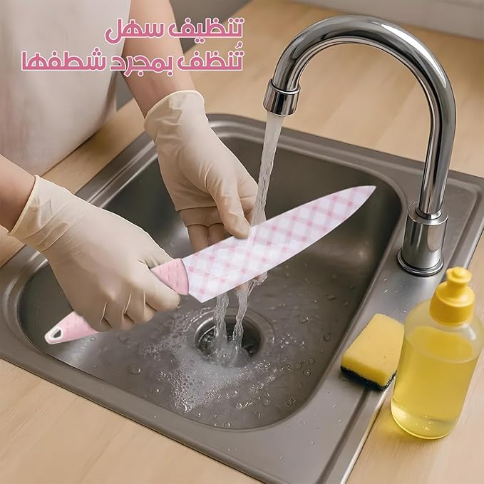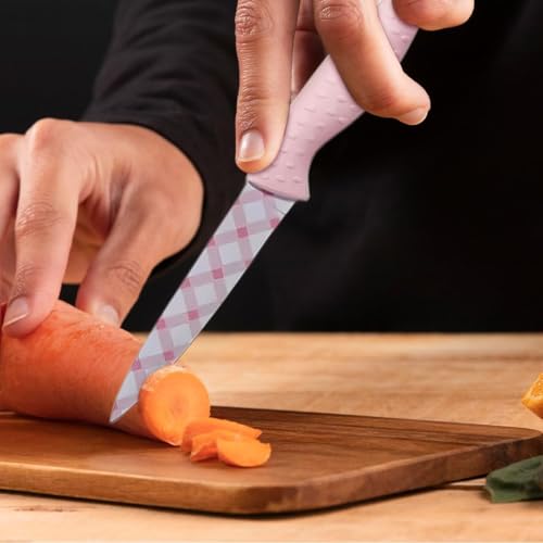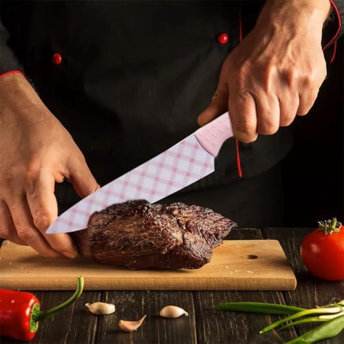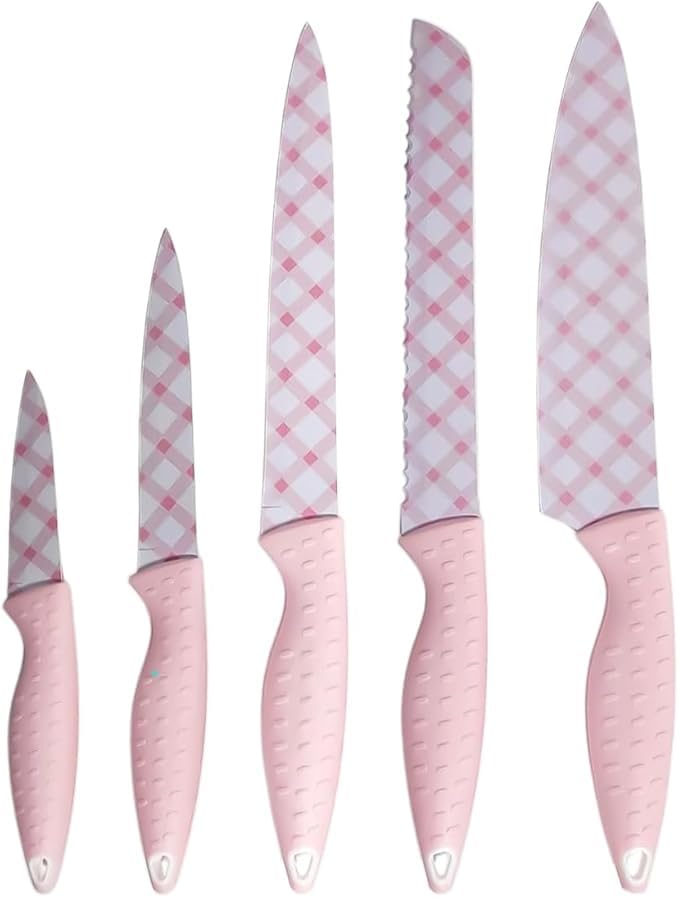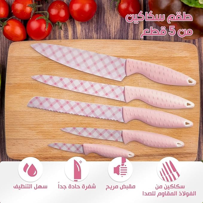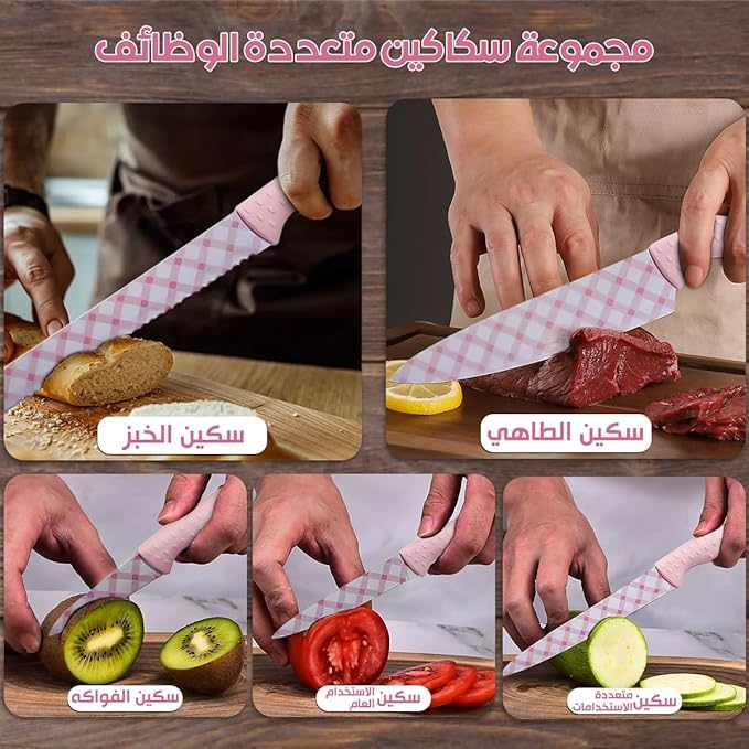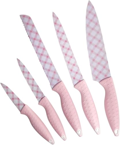 Generic - طقم سكاكين مطبخ مع شفرات من الفولاذ المقاوم للصدأ ومقابض قوية، سكينة شيف متعددة الاستخدامات لتقطيع الخبز، مجموعة ادوات مائدة حادة للطبخ الاحترافي والاستخدام المنزلي، 5 قطع، لون بينك