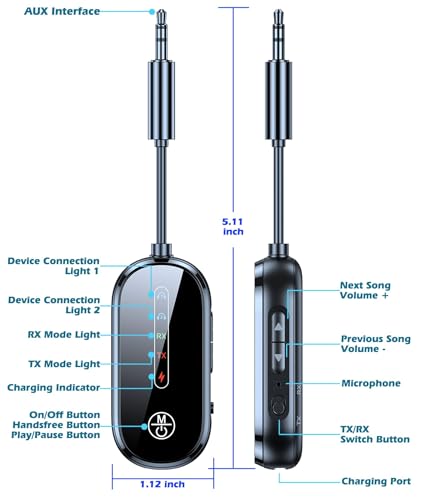 - 【جهاز إرسال واستقبال بلوتوث 2 في 1】يدعم محول البلوتوث ايه يو اكس وضع استقبال ار اكس ووضع إرسال تي اكس. يمكن تعديل وضعي التشغيل حسب الرغبة، ولم يعد الاستماع إلى الموسيقى محدودًا. يمكن أن يوفر محول AUX إلى البلوتوث وظيفة البلوتوث للأجهزة الصوتية مثل مكبرات الصوت أو الستيريو المنزلي أو مكبرات الصوت أو سماعات الرأس أو مكبرات الصوت في السيارة، حتى تتمكن من الاستمتاع ببث الموسيقى اللاسلكي