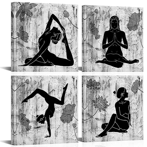 Kolo Wall Art - لوحة فنية جدارية قماشية تجريدية بنمط يوغا مطبوعة باللون الأسود والأبيض مع زهرة اللوتس، ديكور حائط عصري مؤطر لتزيين جدار المنزل من كولو، 30 × 30 سم، 4 لوحات