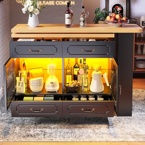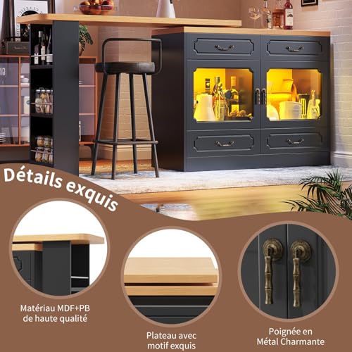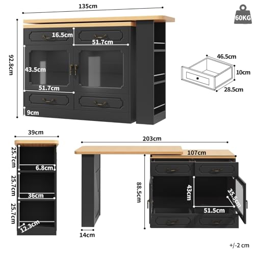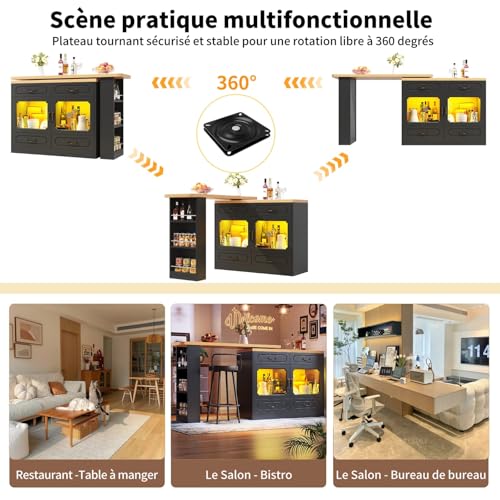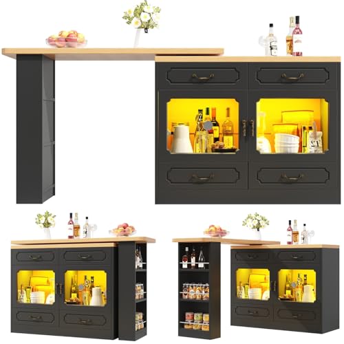 KOMHTOM - طاولة طعام دوارة مع خزانة تخزين من كومفتوم، طاولة بار قابلة للتمدد، بار مطبخ مع مساحة تخزين، خزانة جانبية مع ارفف وزجاج (اسود-2)