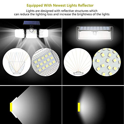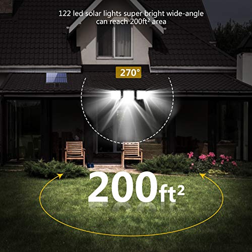 - ☀ إضاءة أكثر سطوعًا ومساحة عريضة 270 درجة: المصابيح التي تعمل بالطاقة الشمسية للأماكن الداخلية والخارجية مجهزة بـ 122 قطعة من مصابيح LED عالية الطاقة، فهي توفر إضاءة ممتازة لأكثر من 1200 لومن، وهي أكثر سطوعًا من المصابيح الأخرى المشابهة، إن المصابيح التي تعمل بالطاقة الشمسية المزودة بـ3 رؤوس توفر إضاءة قابلة للتعديل ورؤوس مصابيح سهلة الضبط وأغطية أمامية للعدسات وجهاز استشعار حركة بزوايا مختلفة حسب متطلباتك، كما يمكنك التقاط زاوية إضاءة عريضة تبلغ 270 درجة.