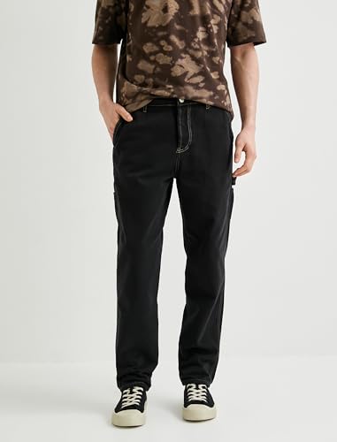 1 × بنطال كوتون قطن بأزرار بتفاصيل خياطة للرجال، مقاس 38، 999 أسود