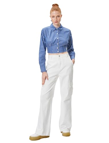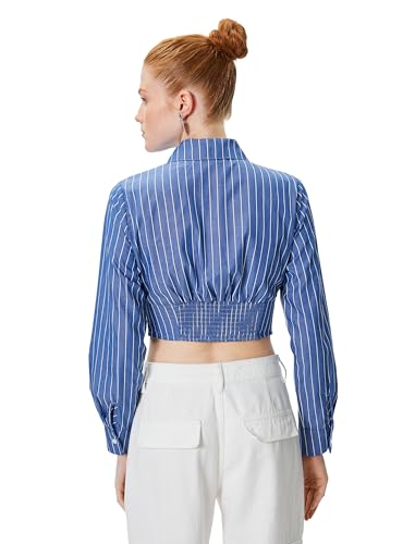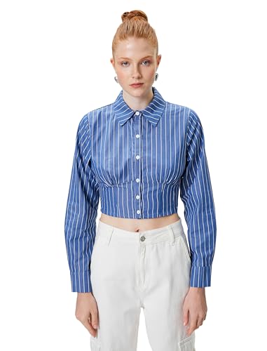 KOTON - قميص قصير برقبة كلاسيكية وأكمام طويلة للنساء من كوتون، مقاس 36، أزرق مخطط