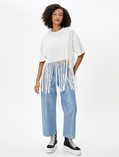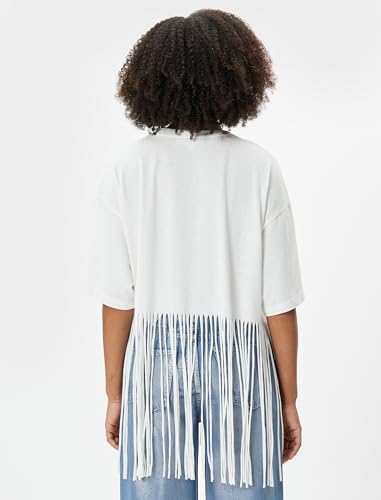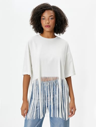 KOTON - تيشيرت قصير بشراشيب وأكمام قصيرة ورقبة دائرية ضيقة للنساء من كوتون، مقاس XS - بيج فاتح