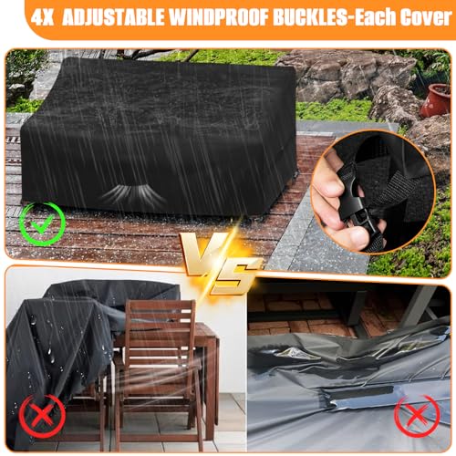 - 【مادة مقاومة للماء شديدة التحمل】- أغطية مجموعة أثاث الفناء مصنوعة من قماش اوكسفورد 420D المبطن ببلاستيك بي في سي، غطاء أثاث الحديقة شديد التحمل هذا مقاوم للماء والأشعة فوق البنفسجية ومقاوم للتمزق ومقاوم للبهتان، يحمي أثاثك بشكل أفضل من البيئات القاسية مثل أشعة الشمس القوية والمطر والثلج والغبار وأكثر من ذلك. طلاء إضافي مثبت بالأشعة فوق البنفسجية وطلاء طارد للماء، لذلك لن يخترق الماء، ويمكن أن ينزلق بسرعة، ويحافظ على سطح جاف.