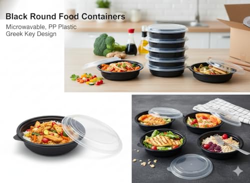 - حاويات عالية الجودة للاستعمال مرة واحدة - أوعية متينة من البولي بروبلين الأسود بنمط مفتاح يوناني أنيق. مصممة كحاويات الوجبات الجاهزة للاستعمال مرة واحدة ولكنها متينة بما يكفي لإعادة الاستخدام عدة مرات.