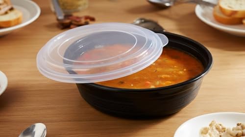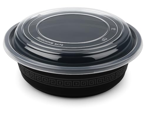 KRNO - كرنو حاويات طعام سوداء مستديرة للاستعمال مرة واحدة مع اغطية شفافة - امنة للاستخدام في الميكروويف - نمط مفتاح يوناني - اوعية 16 اونصة و24 اونصة - حاويات طعام خارجية قابلة لاعادة الاستخدام من البولي
