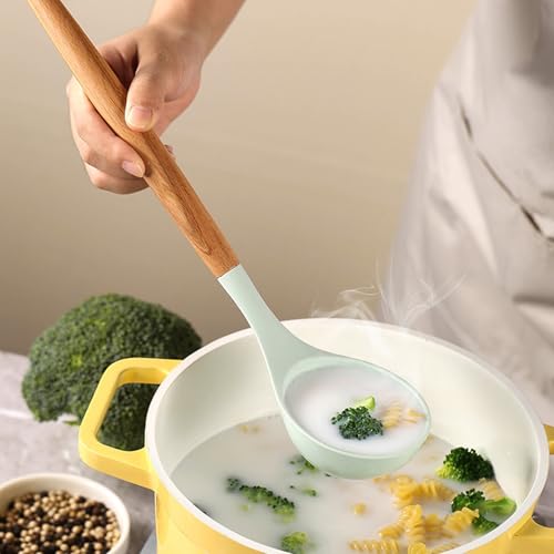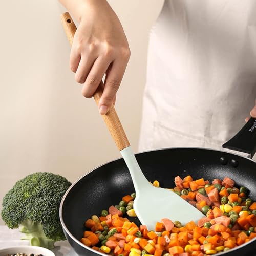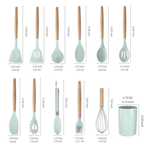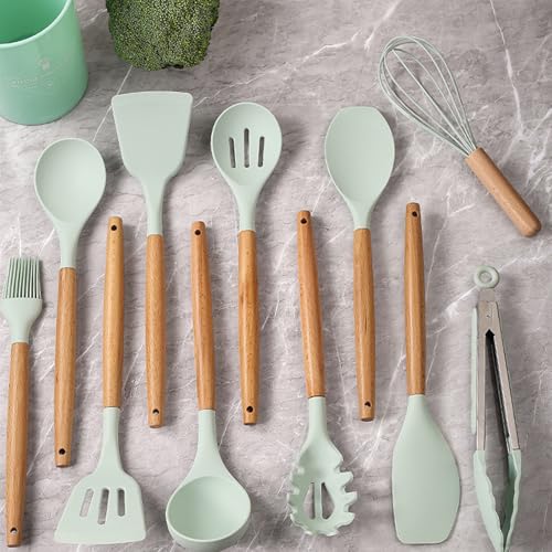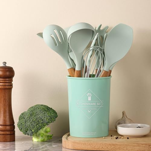 KSENDALO - مجموعة أدوات مطبخ سيليكون من 12 قطعة مع حامل، أدوات طهي مقاومة للحرارة وغير لاصقة ومزودة بمقابض خشبية للخبز والقلي والتقليب من كسيندالو (لون أخضر فاتح (Aqua))
