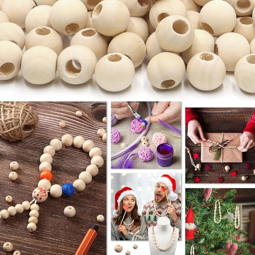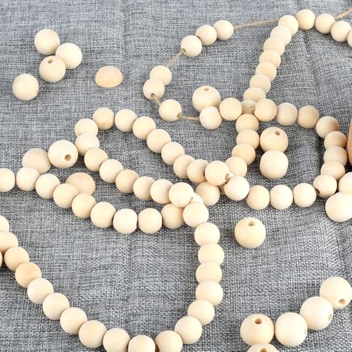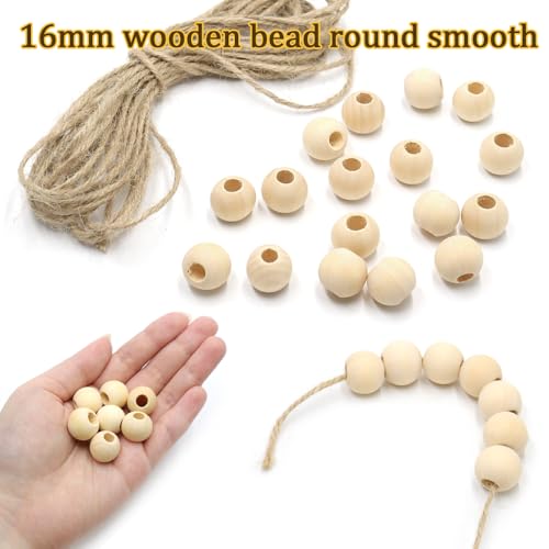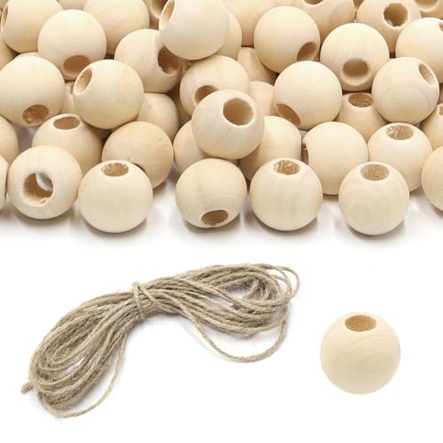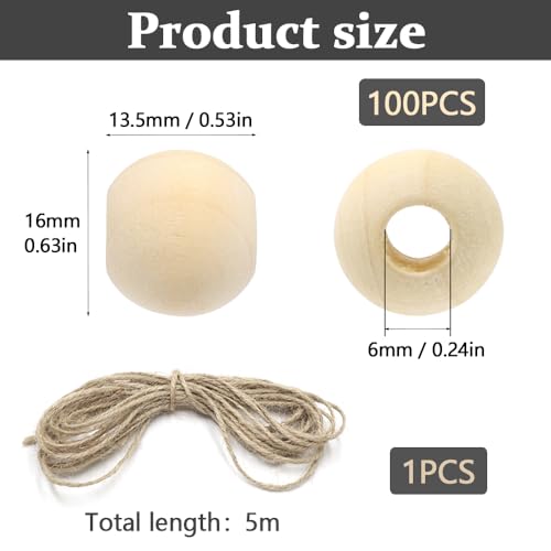 KtbeYTi - خرز خشبي طبيعي مستدير مقاس 16 ملم مع حبل من القنب للديكورات، وصناعة المجوهرات بنفسك، مجموعة من 100 خرزة من كتبيتي (فتحة 6 ملم)